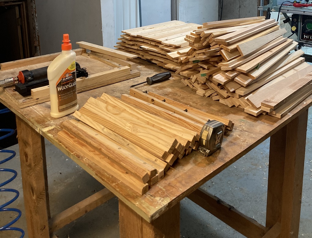 On 9/7/2023, frame assembly for the next year began. The process involves placing and gluing pieces in a jig, and then stapling them. Despite the loud air compressor, two videos demonstrate the process. 36 frames were completed, with bottom pieces being the limiting factor, but easy to make.